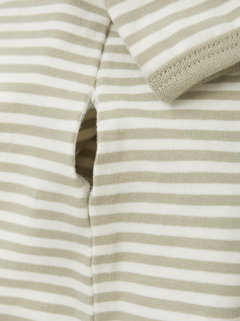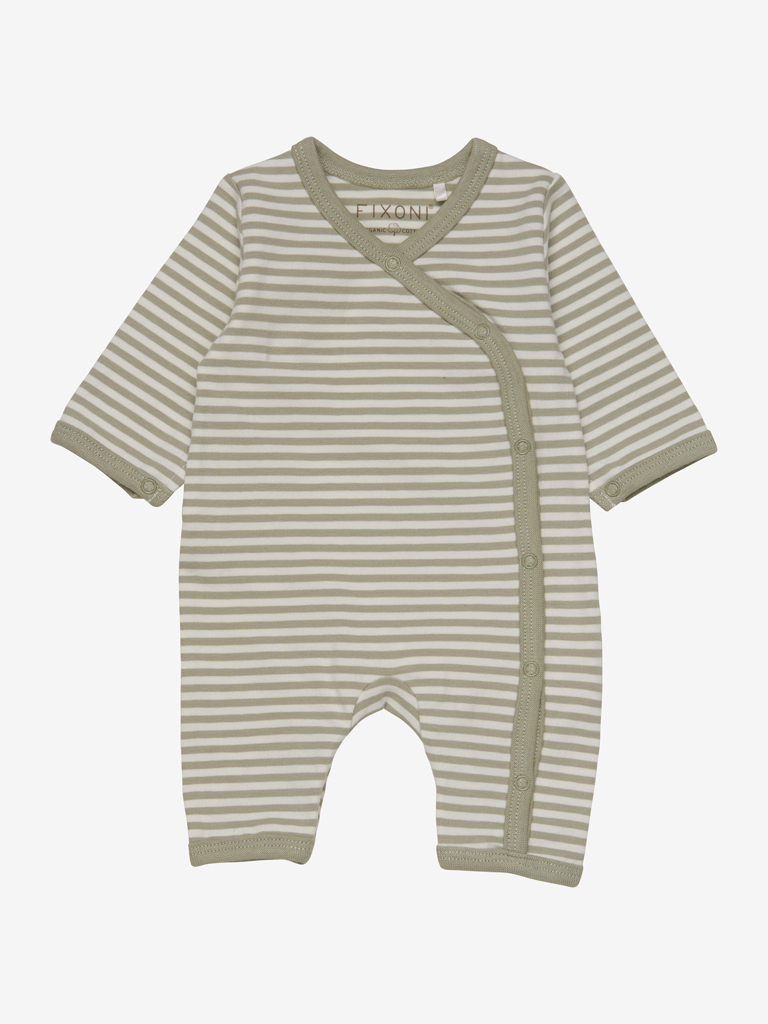Deze onesie of kruippakje is heel zacht en heeft groen/witte strepen.